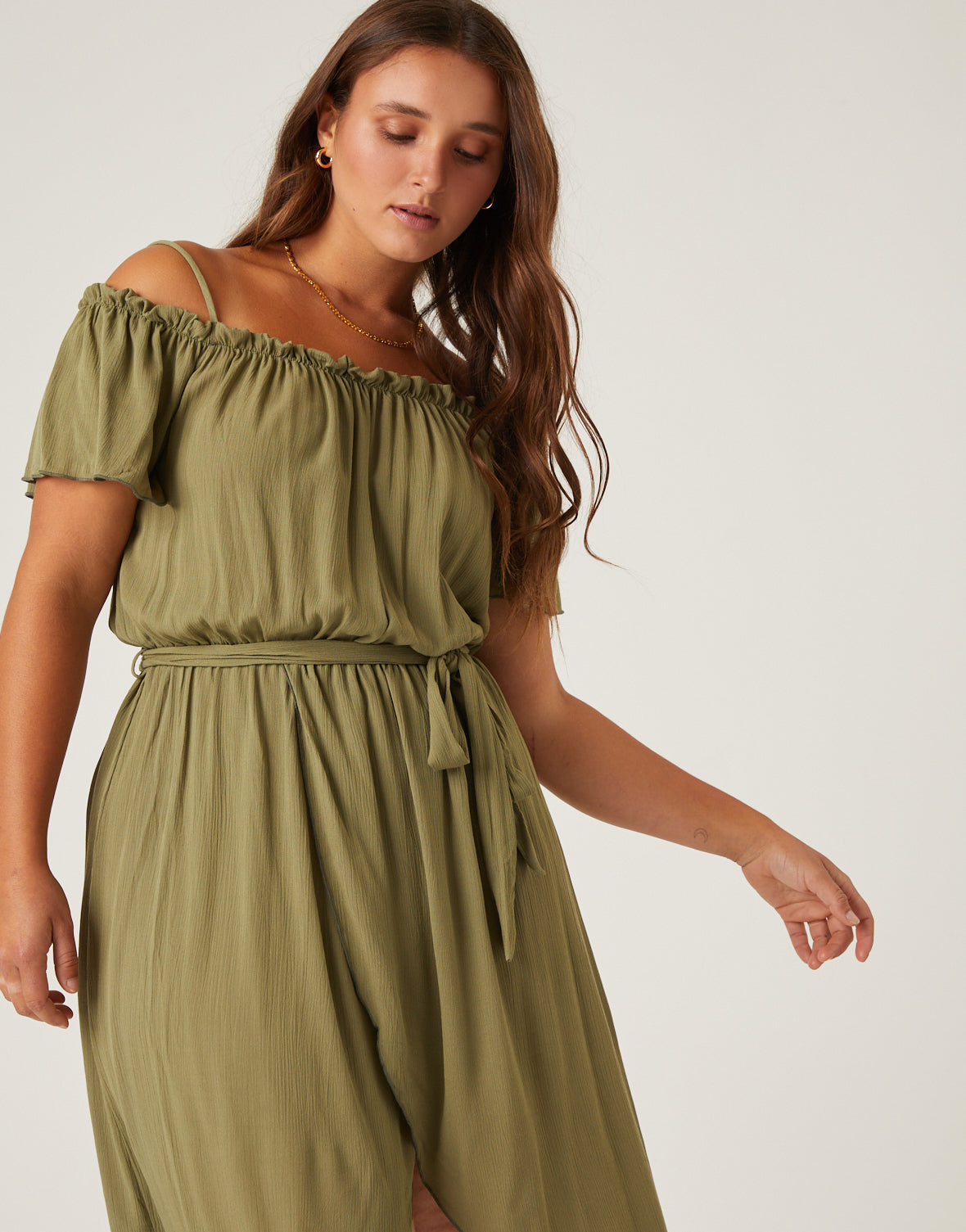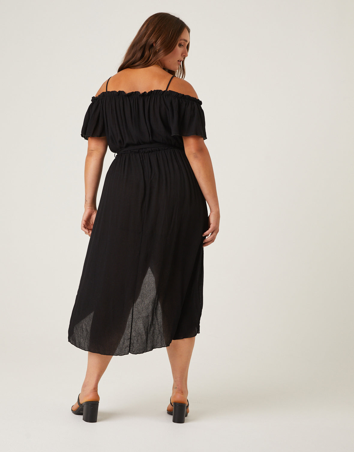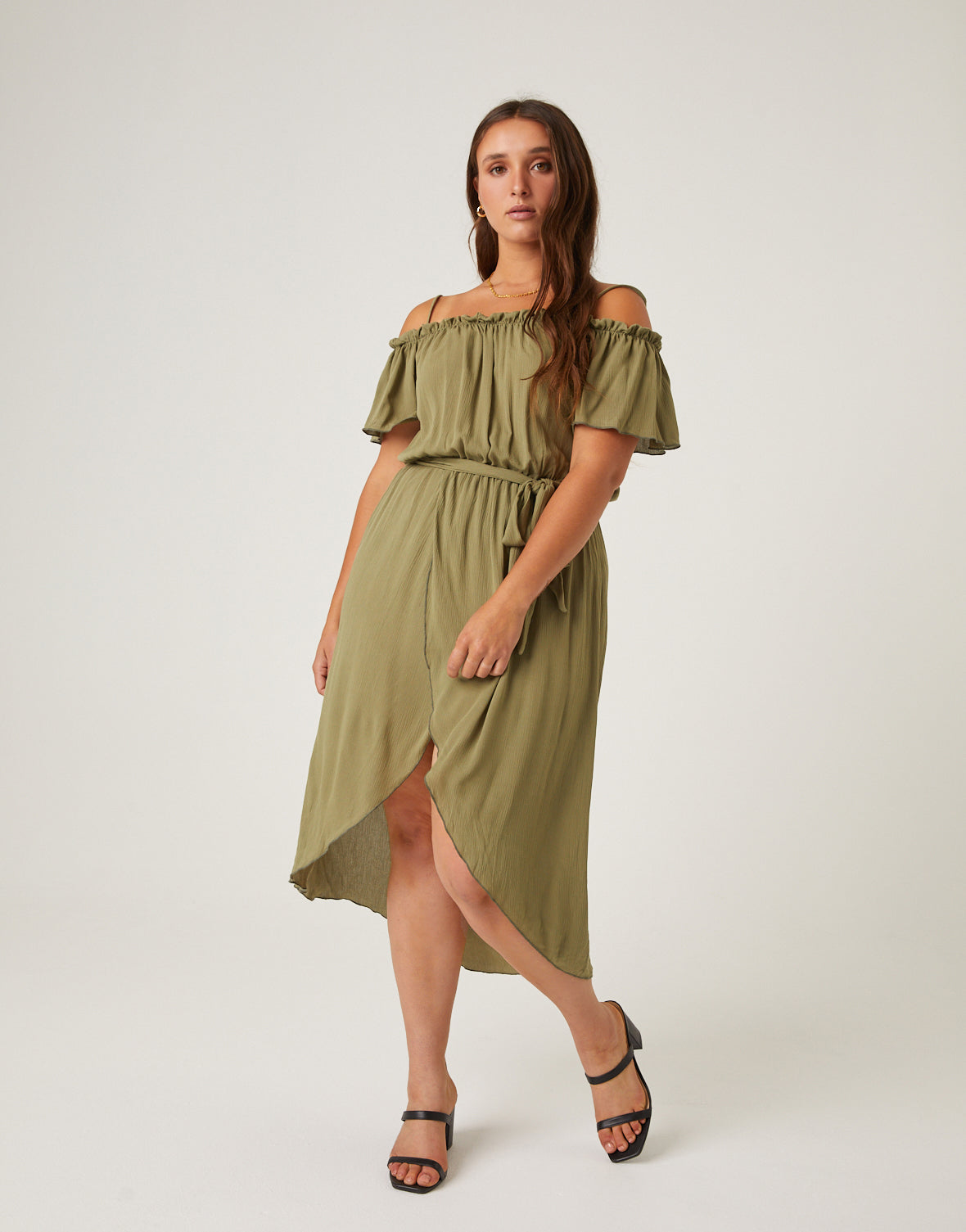 - This dress features an elastic, off-the-shoulder neckline, non-adjustable spaghetti straps, a mock wrap skirt, an elastic waist, and a removable tie belt.