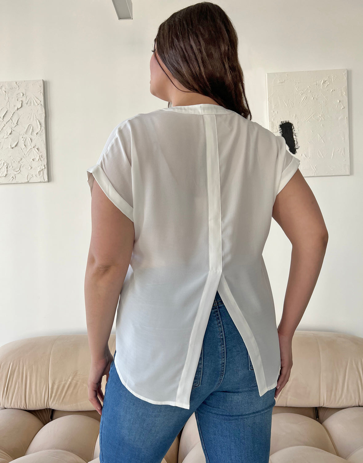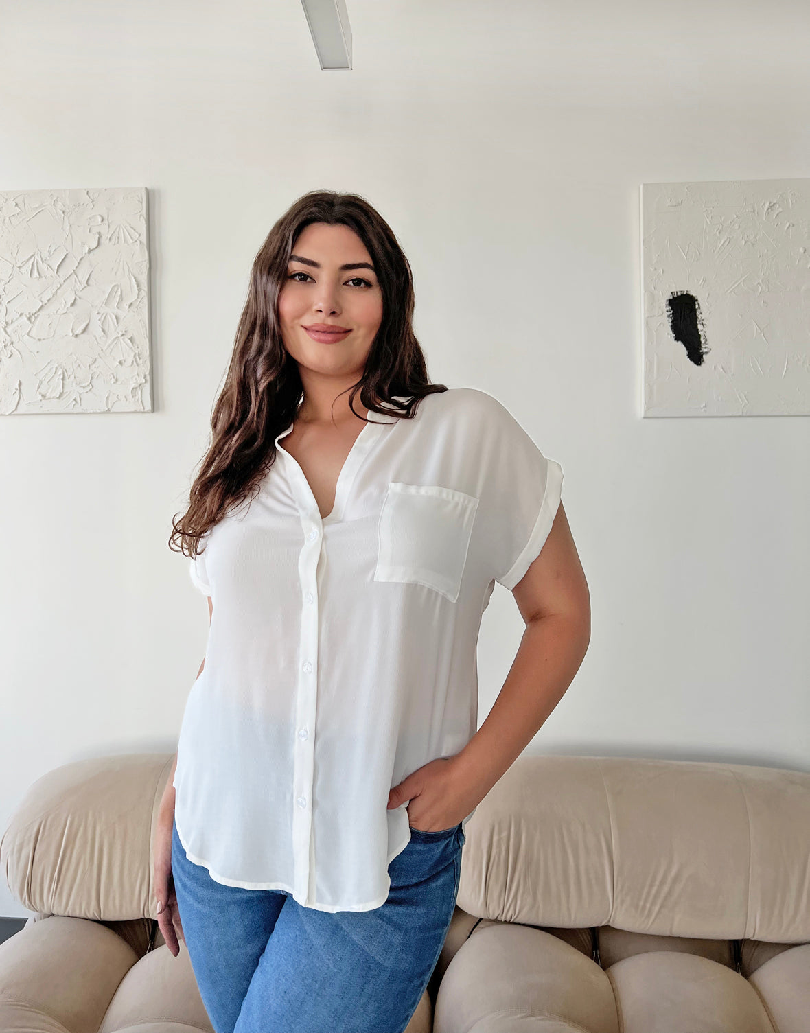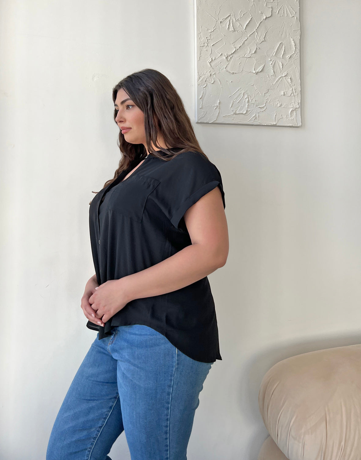 Everyone needs a super basic?button down top in their wardrobe, and the?Curve Chiffon Pocket Tee is just that. It's always easy to pair basics like this with simple or for great casual outfits.