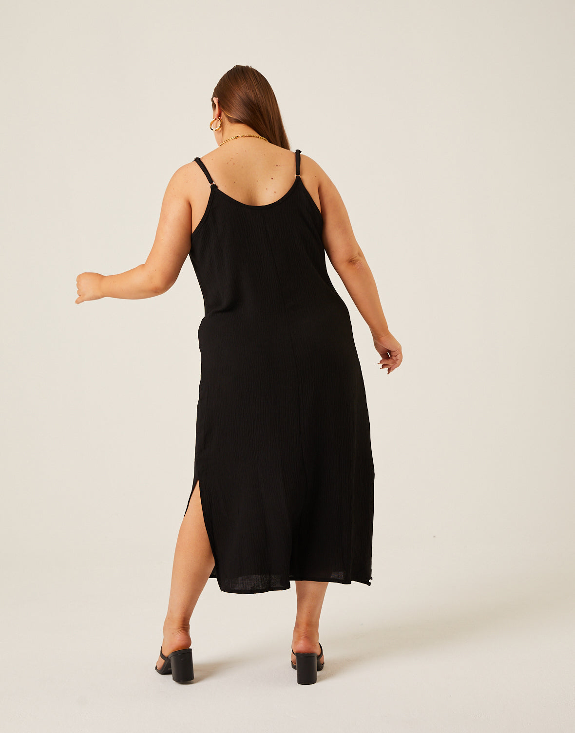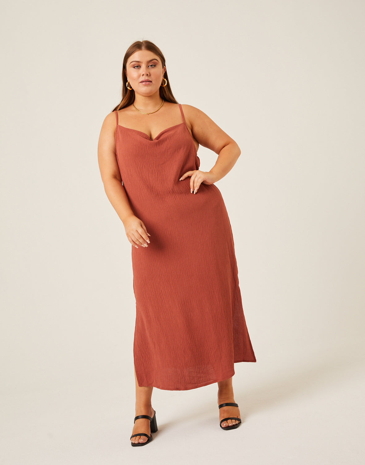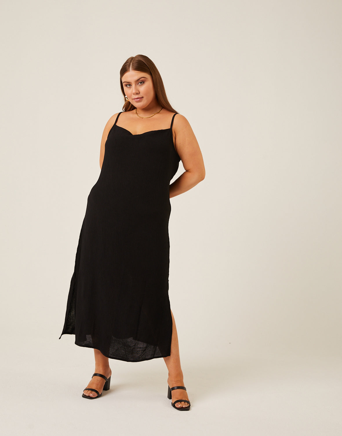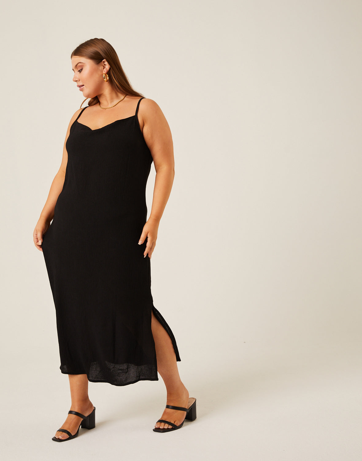 - This plus size slip dress features adjustable spaghetti straps, a side slit, a slightly cowled neckline, and a midi length.