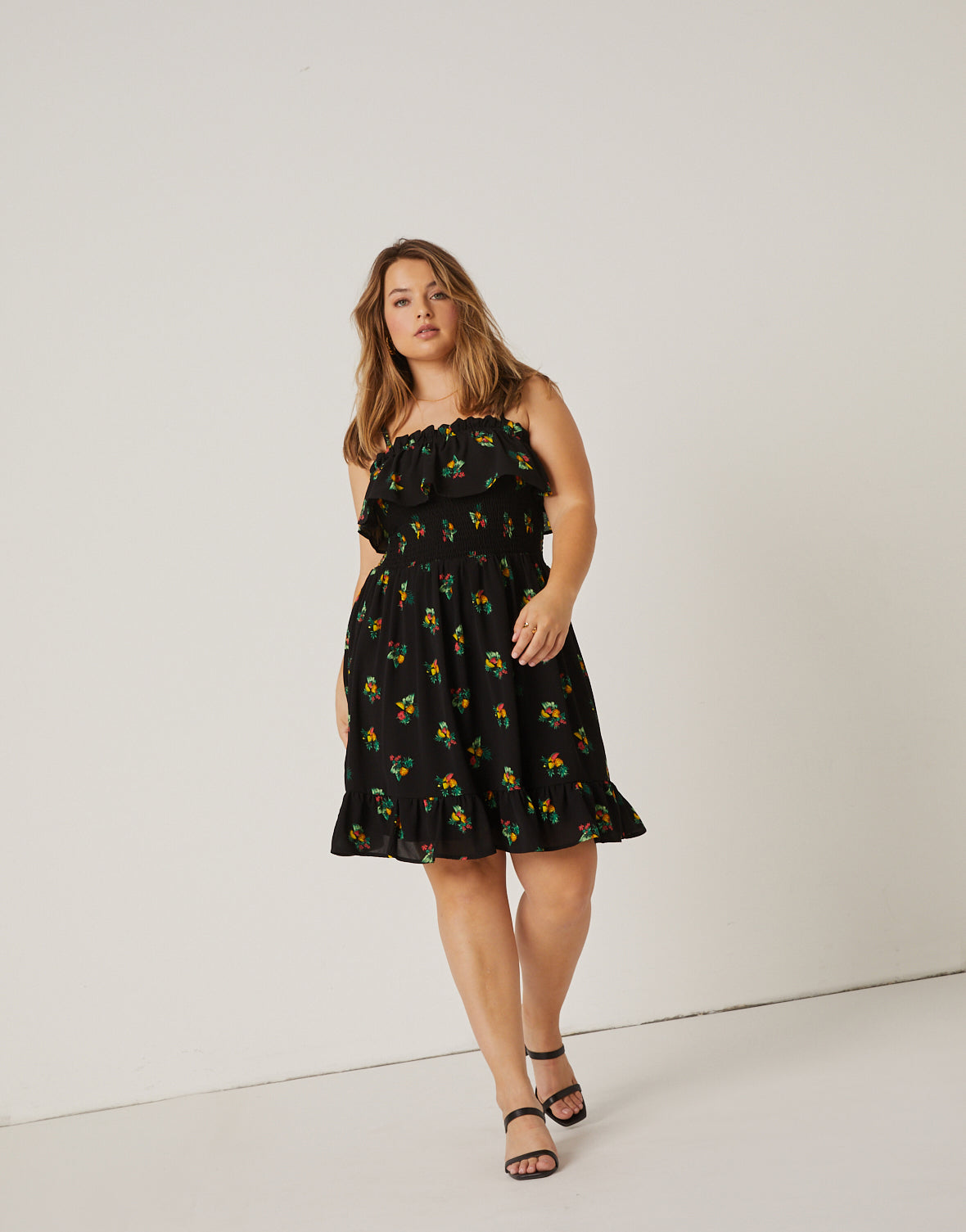 - This dress boasts?adjustable spaghetti straps, a ruffle at top of the bustline, a flowy bottom, and a smocked waist.