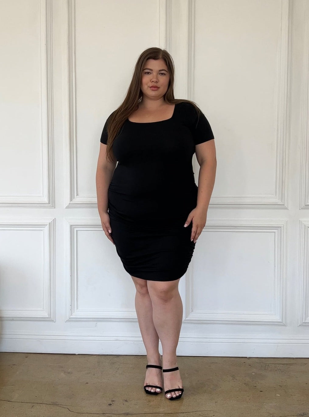 An eye-catching basic, the?Curve Square Neck Ruched Dress is one of our favorite transitional pieces this autumn.