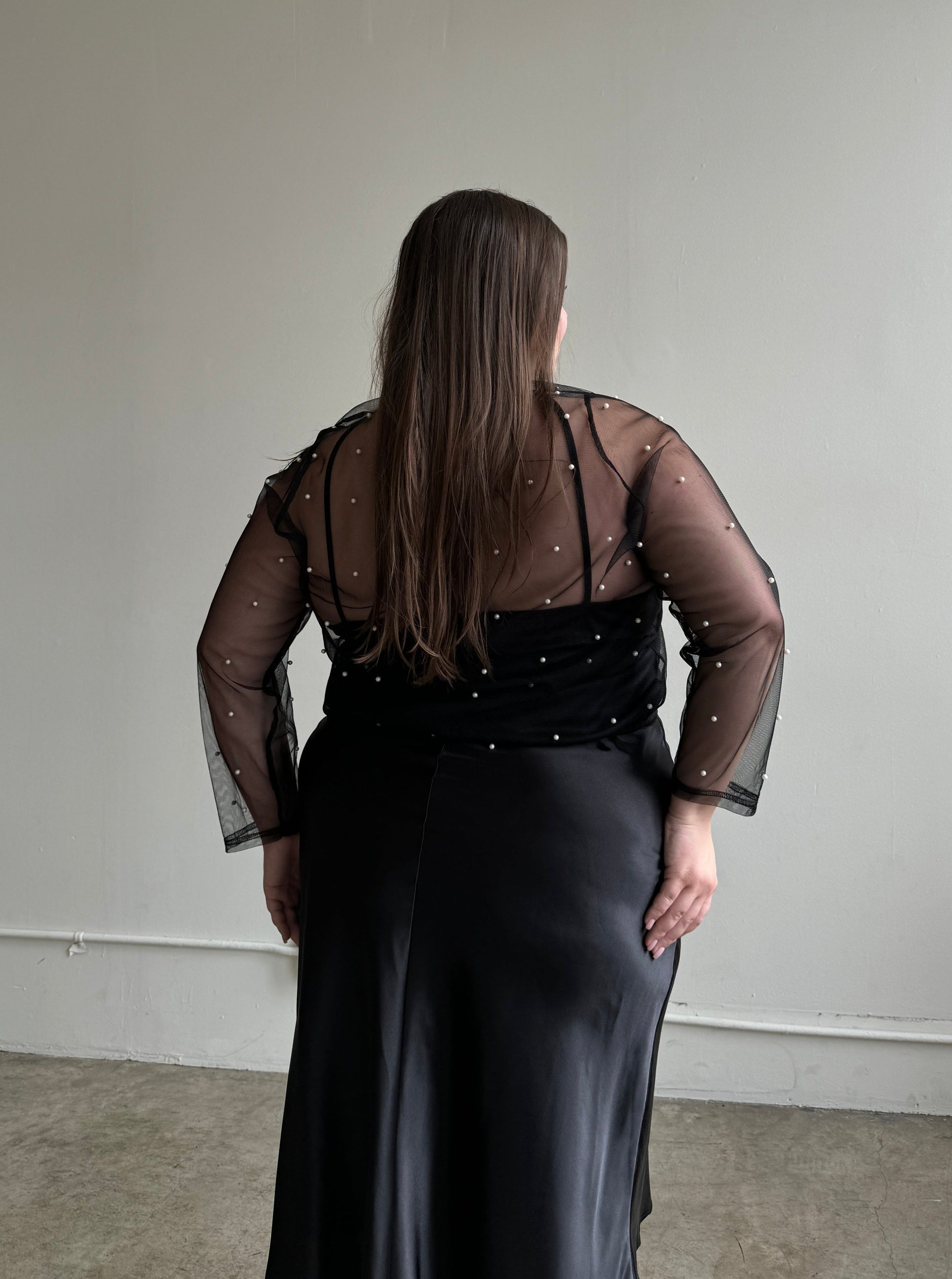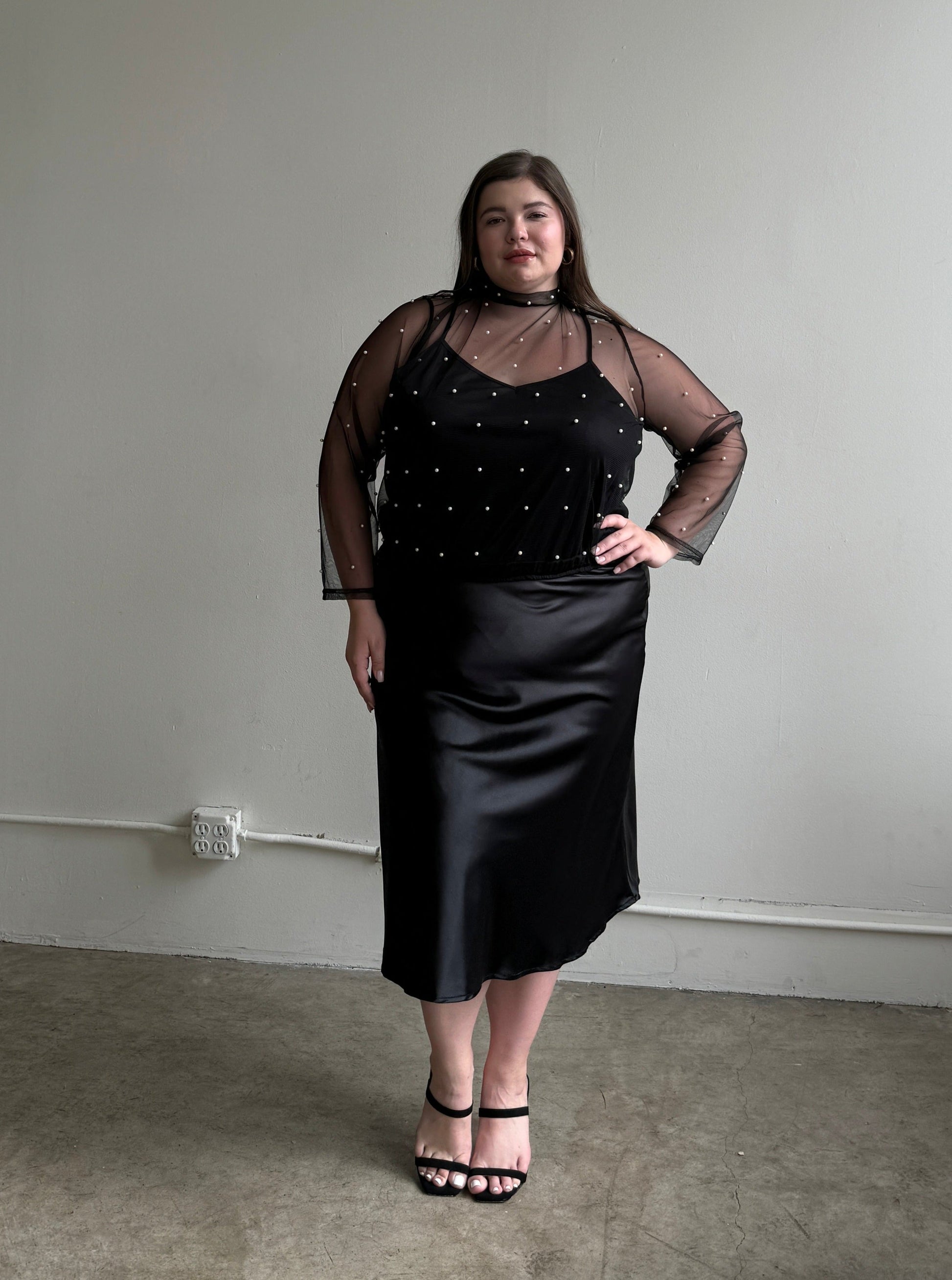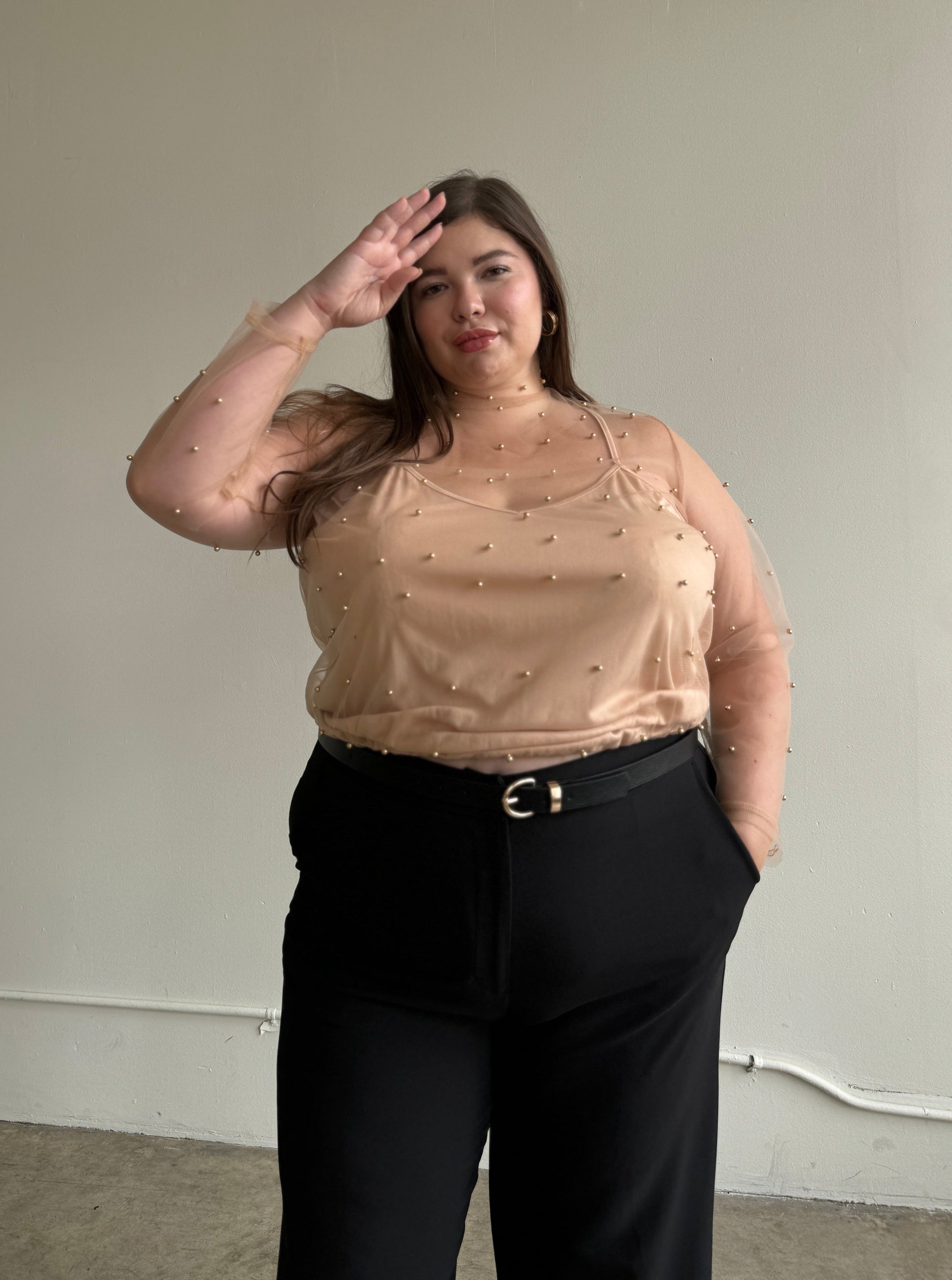 Introducing one of our favorite pieces of the season: the Plus Size Beaded Mesh Mock Neck Top.?The top boasts delicate beading, soft mesh, and a feminine mock neckline, this top is sure to become a staple in your wardrobe. Perfect for a romantic evening or special occasion, this top is sure to turn heads!