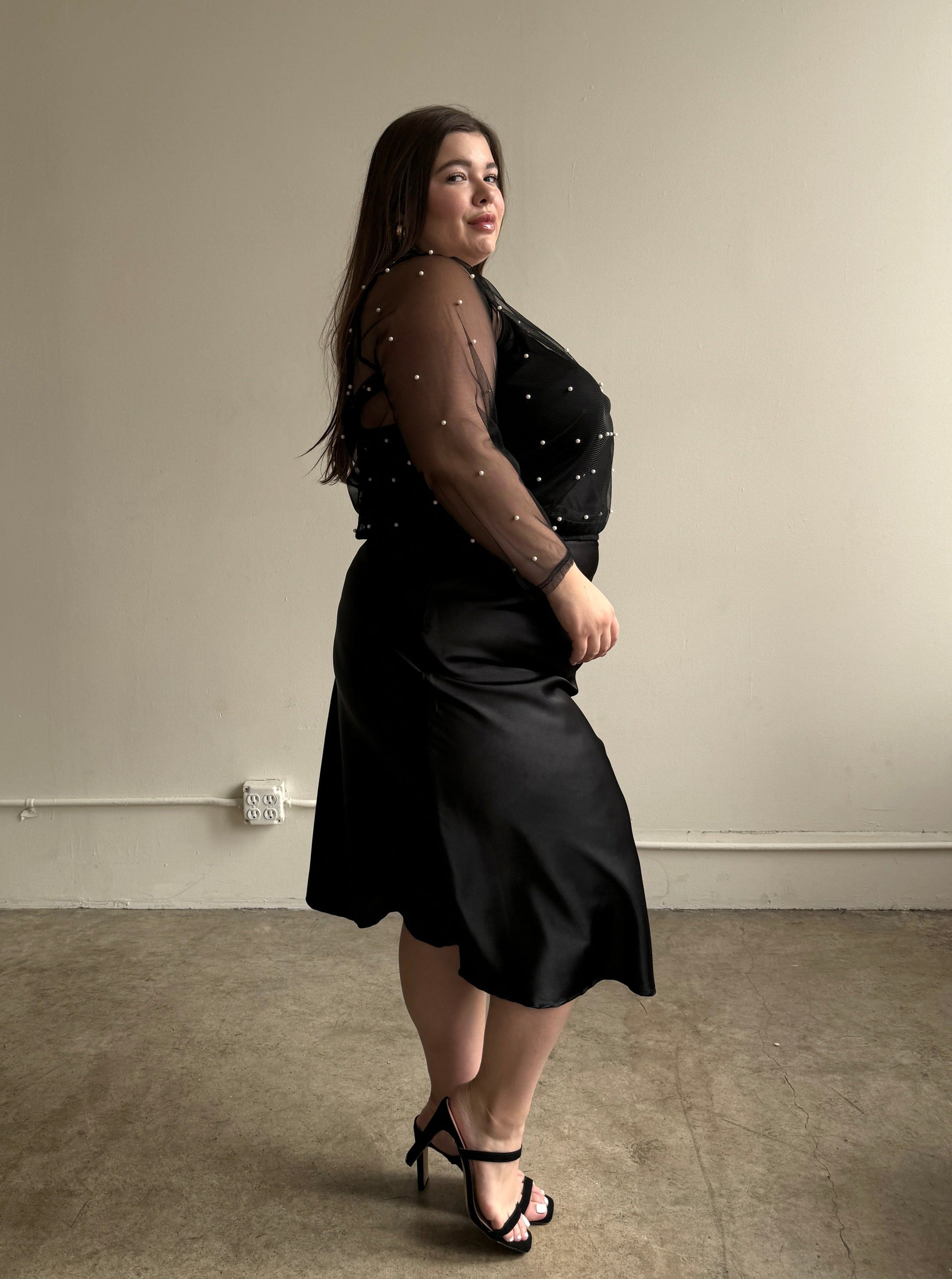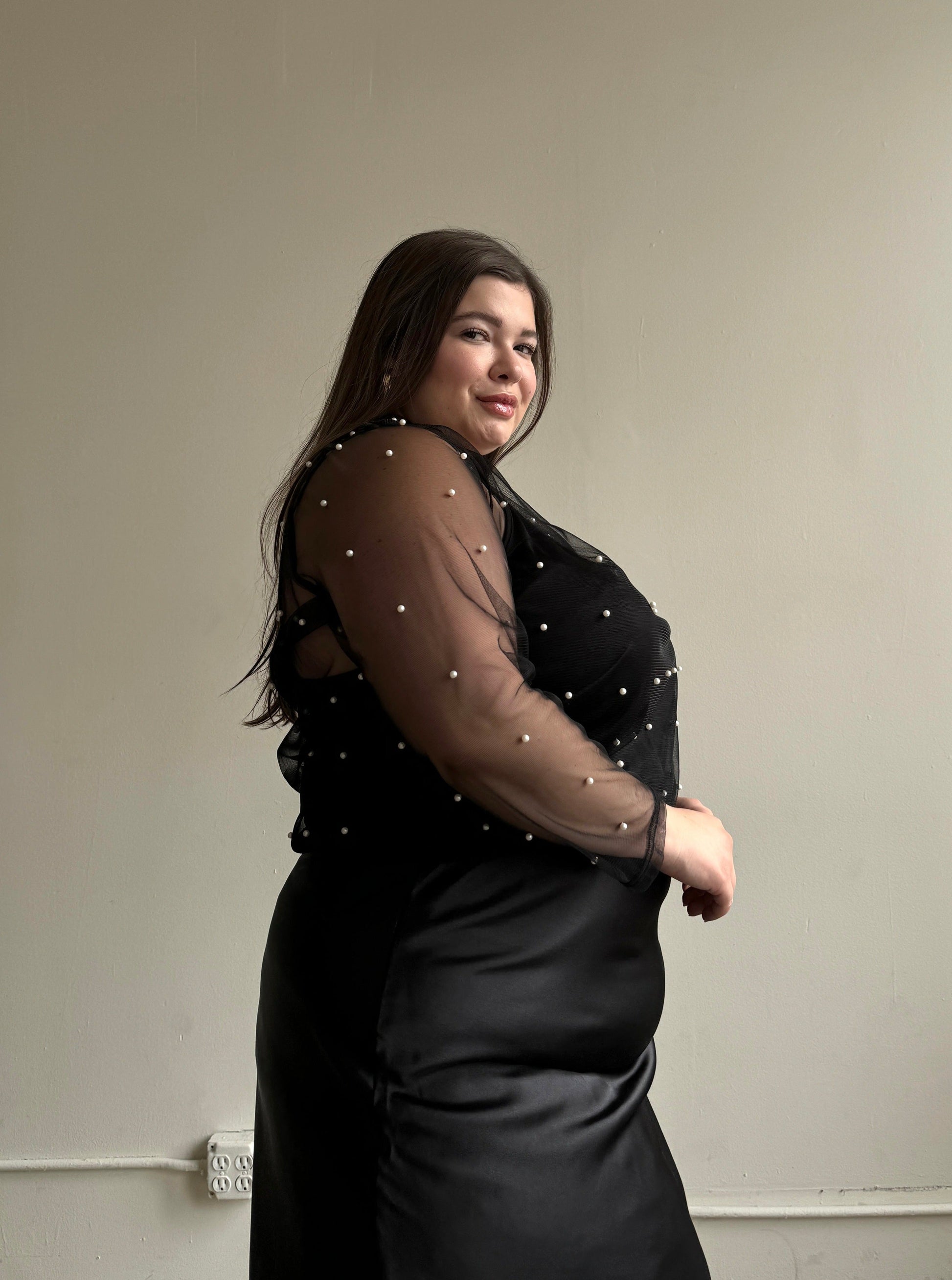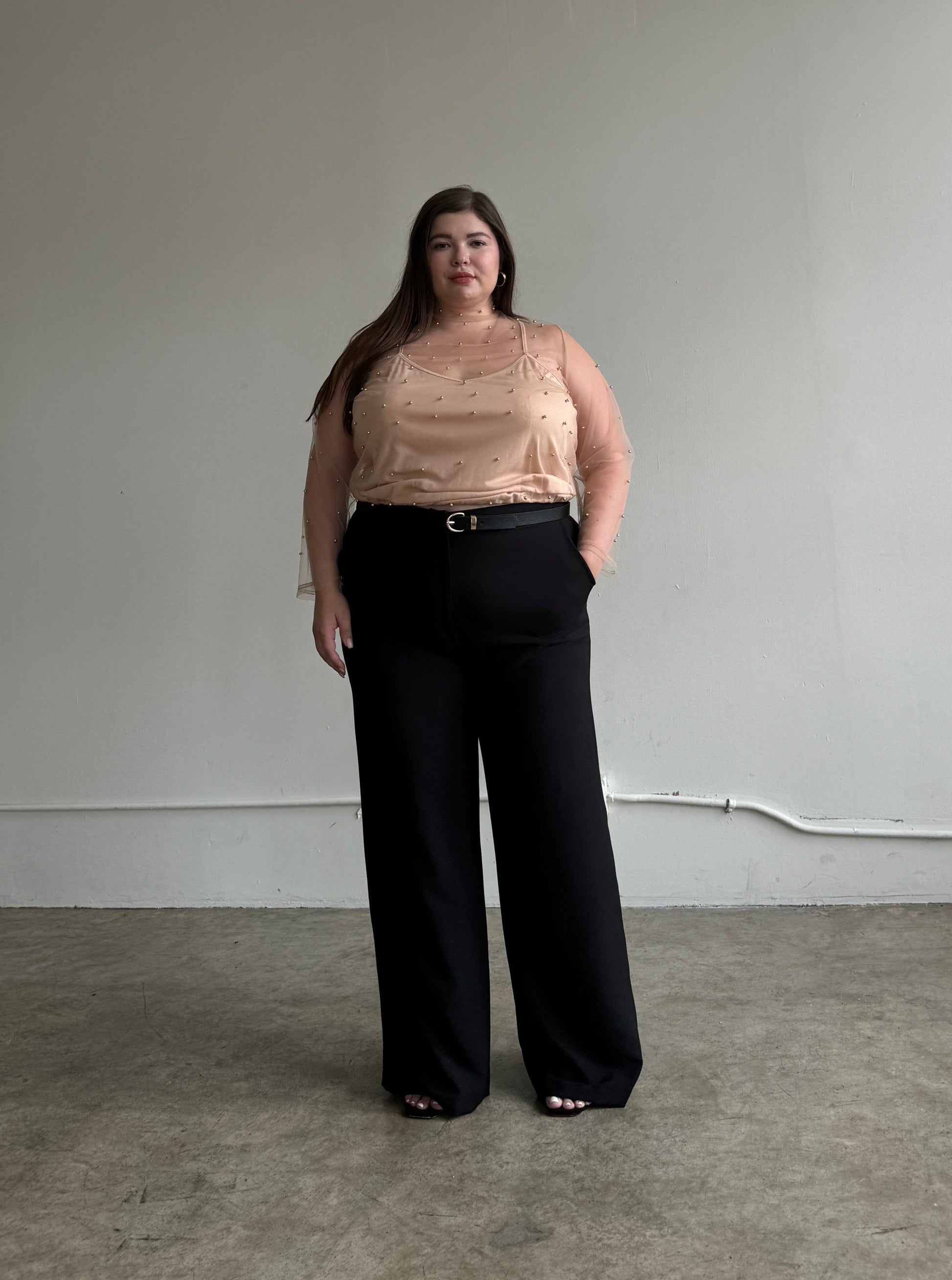 Introducing one of our favorite pieces of the season: the Plus Size Beaded Mesh Mock Neck Top.?The top boasts delicate beading, soft mesh, and a feminine mock neckline, this top is sure to become a staple in your wardrobe. Perfect for a romantic evening or special occasion, this top is sure to turn heads!