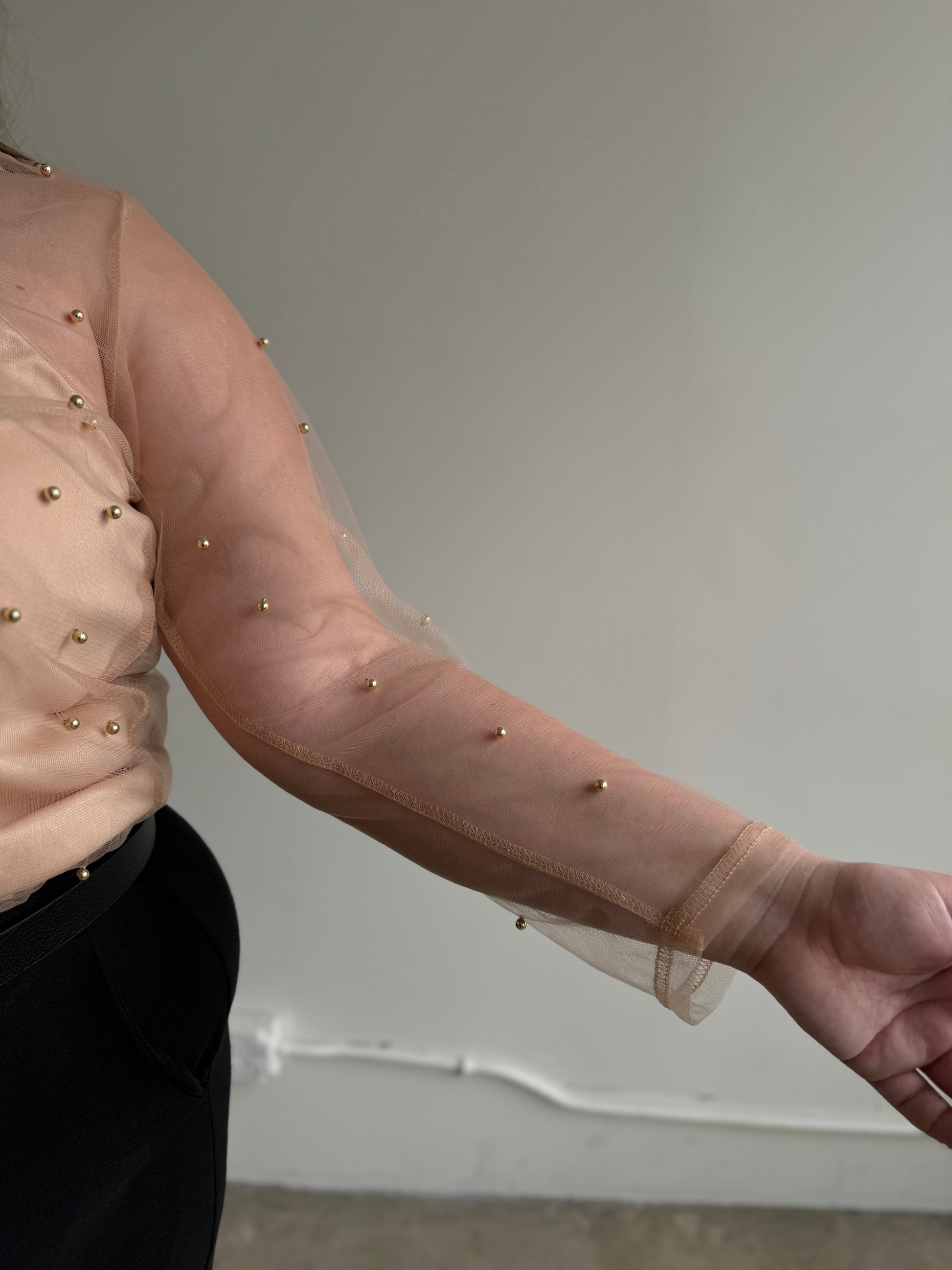- This top features a mock turtleneck neckline, beading spaced all over, a mesh material, long sleeves, and a full length.