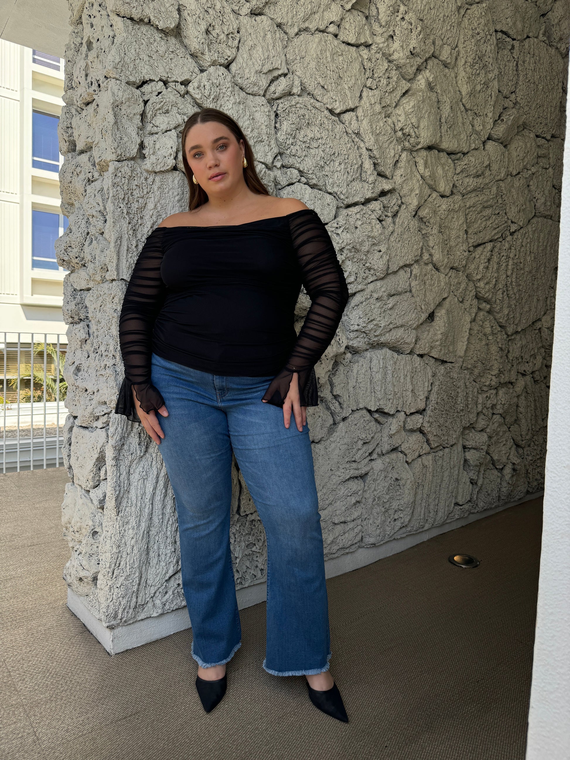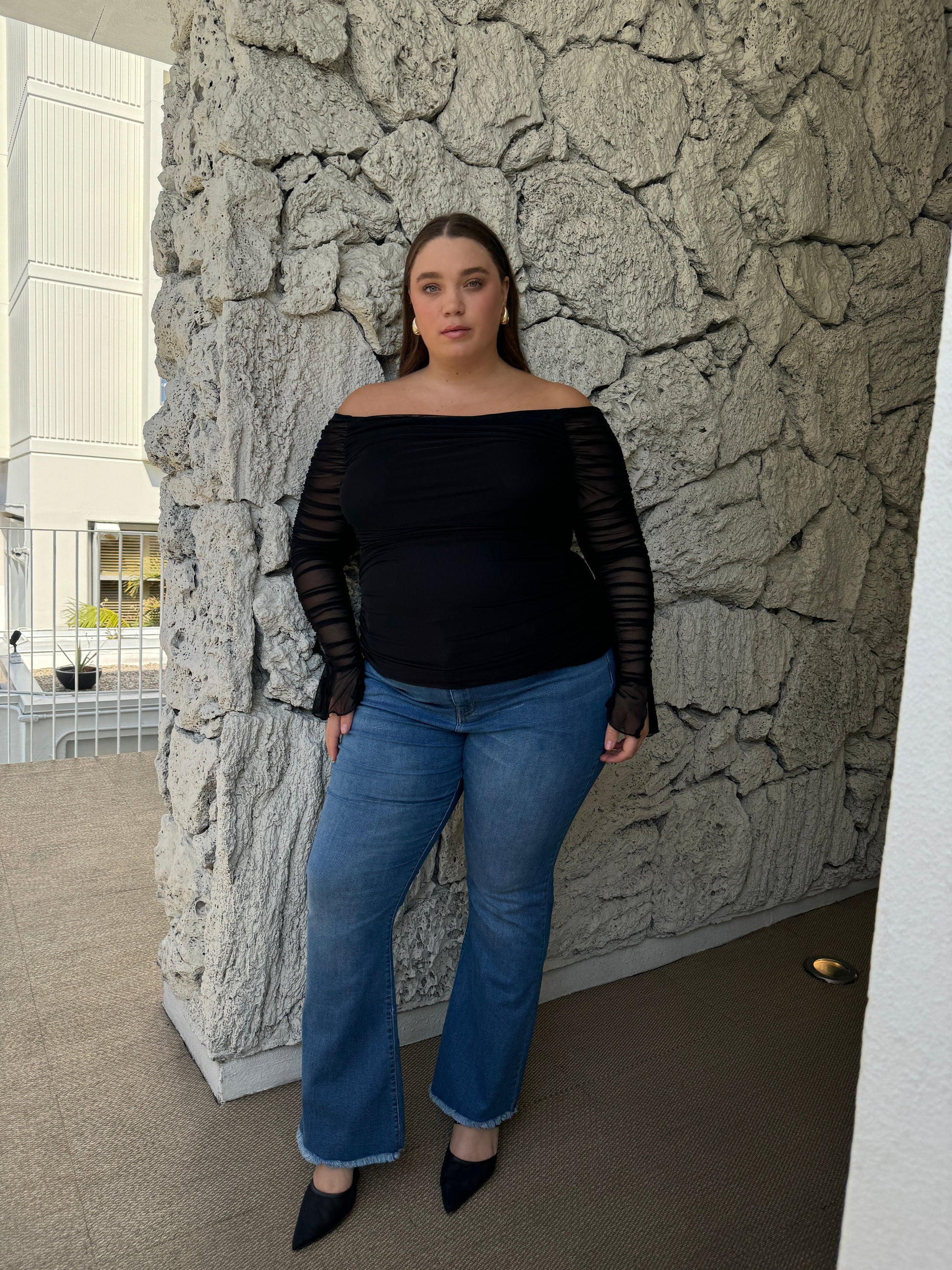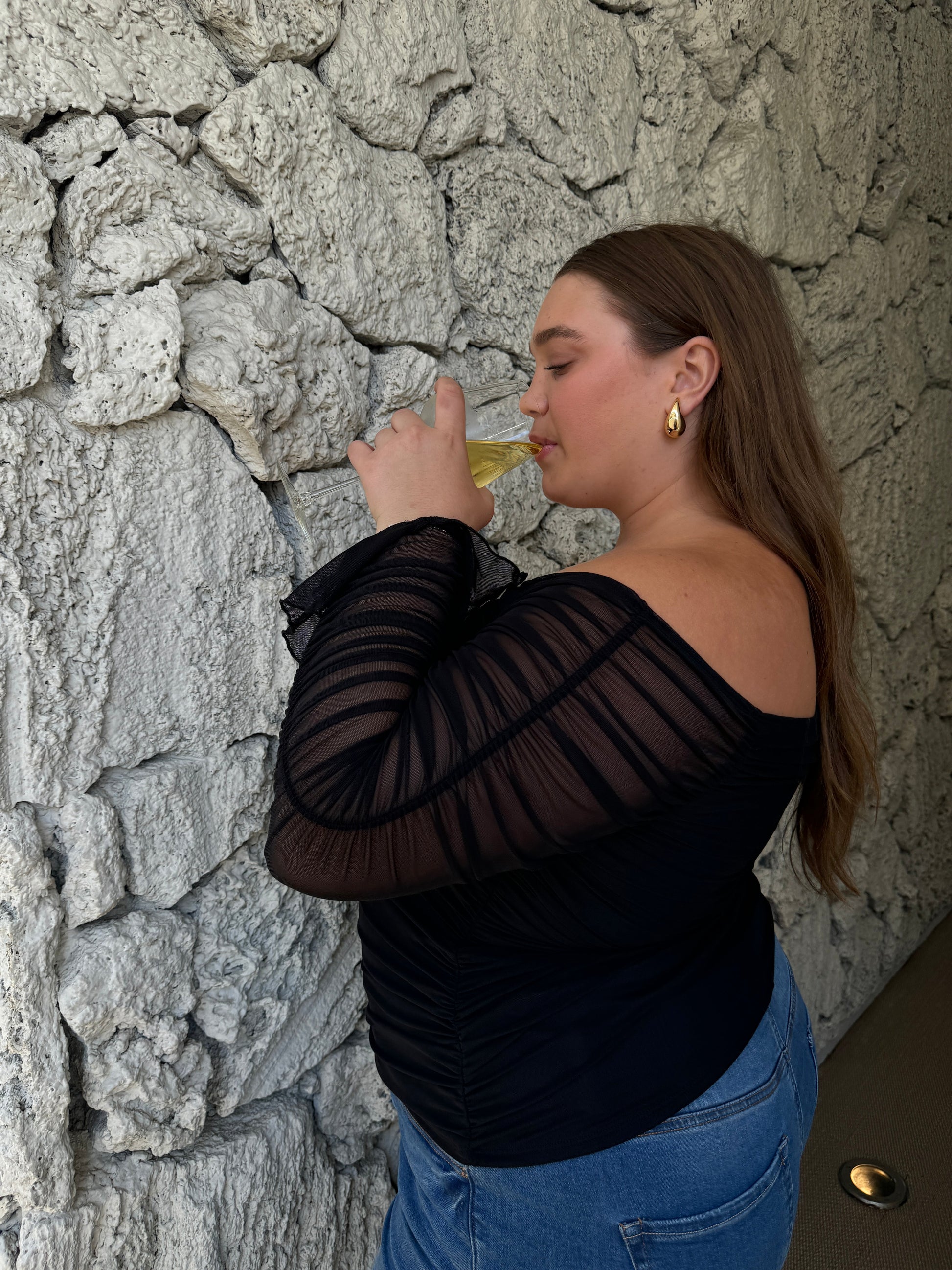 The?Plus Size Drapey Ruched Mesh Sleeve Top is an off-shoulder black top, with mesh sleeves.? The cuff sleeves are also mesh and have a slit in between giving it a very pretty flowy feel.? The Plus Size Drapey Ruched Mesh Sleep Top can be easily paired with some stylish jeans.? Black pants would be perfect if you wanted to keep it more professional.? ? ? ?