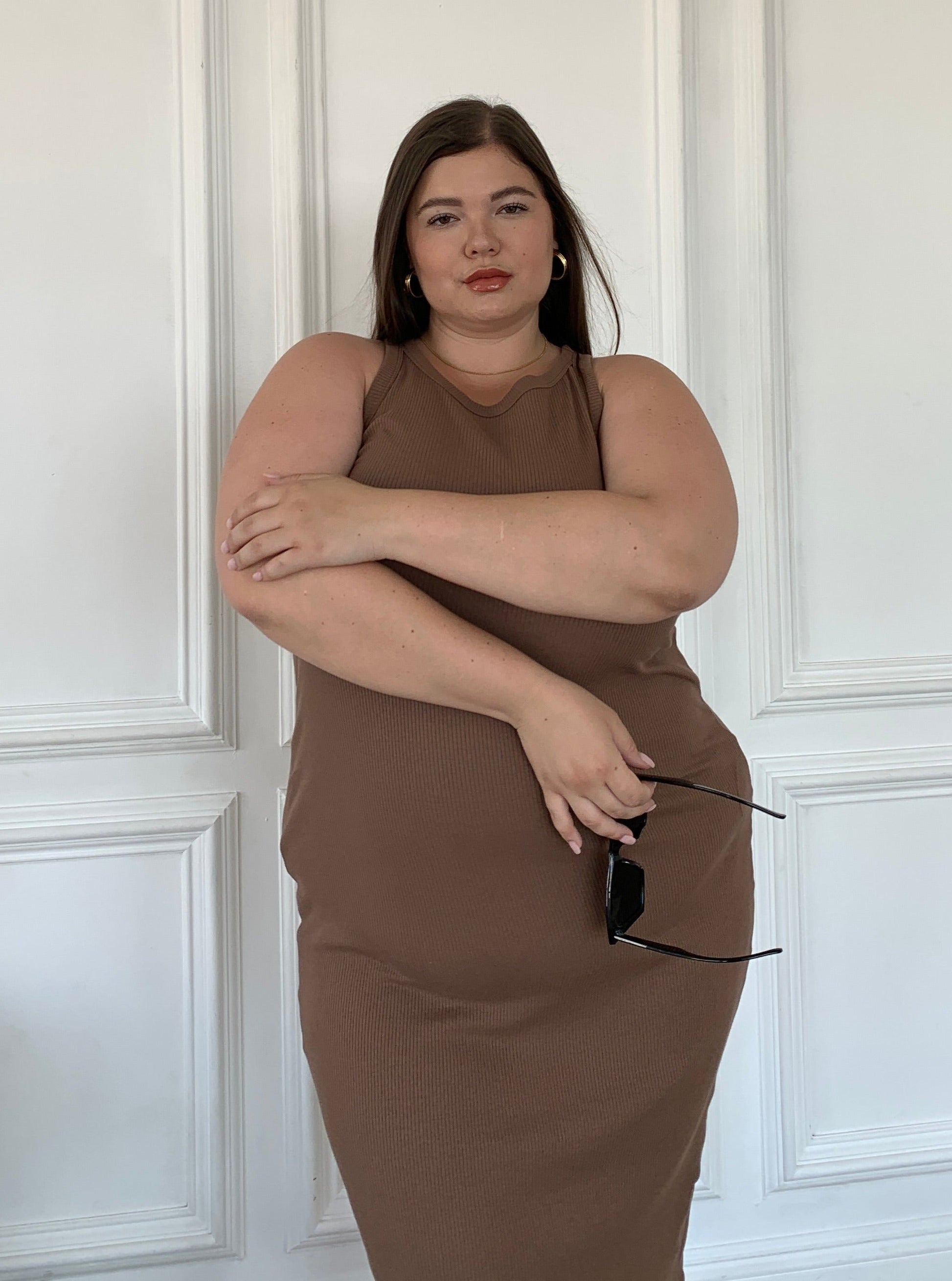 - This dress features a knee-length, bodycon silhouette, a high, crewneck neckline, two shoulder straps, and a ribbed material.