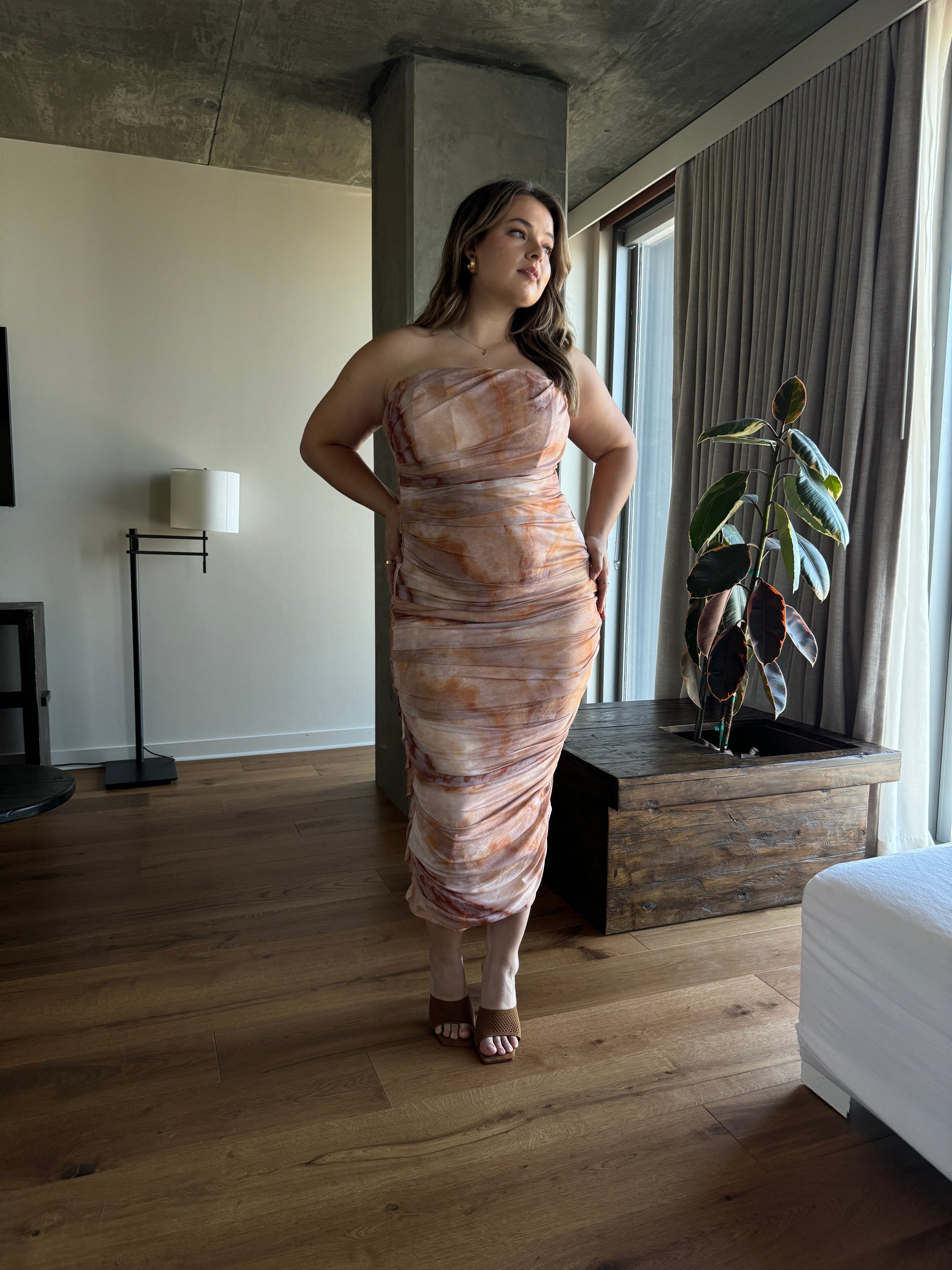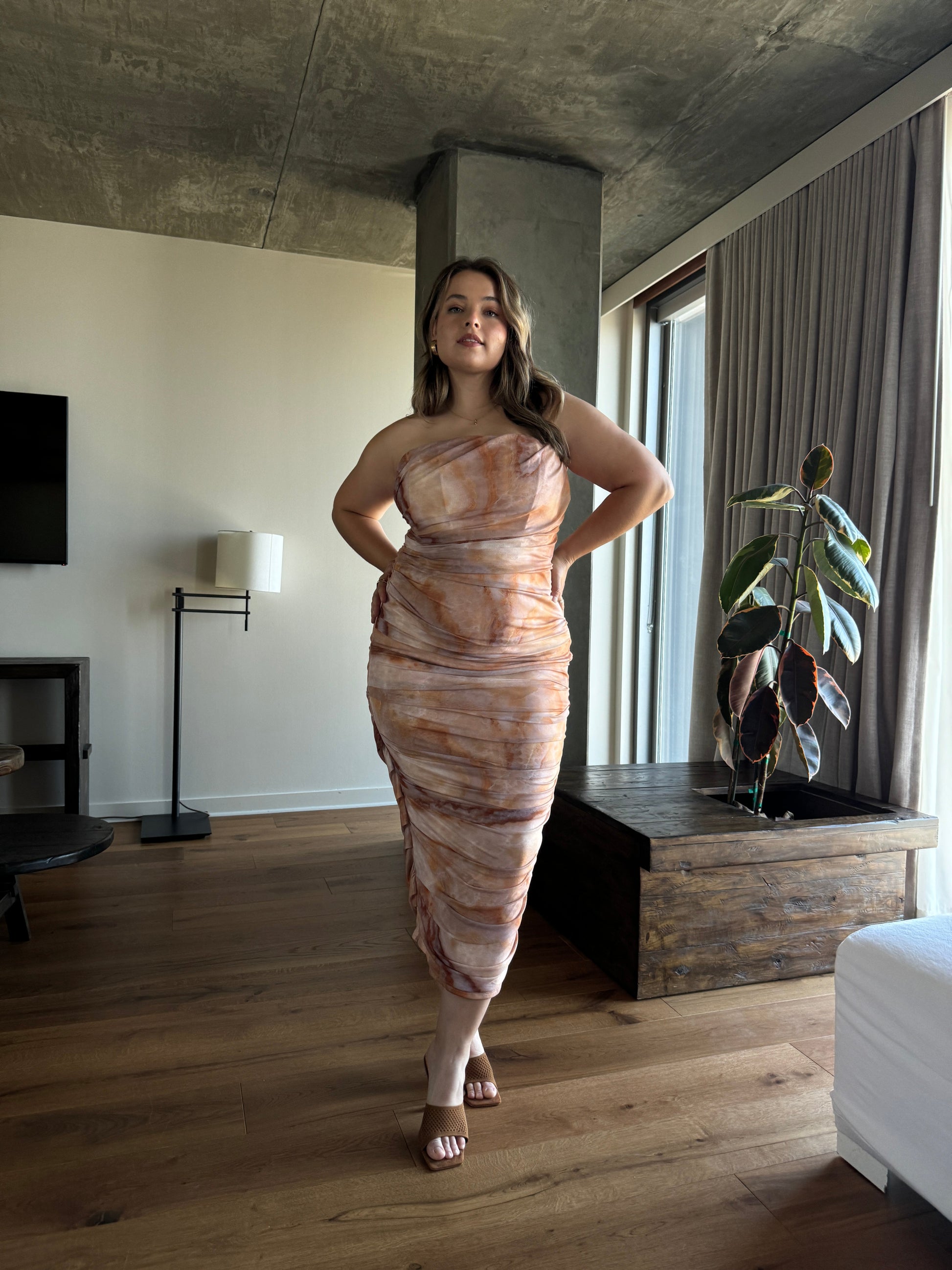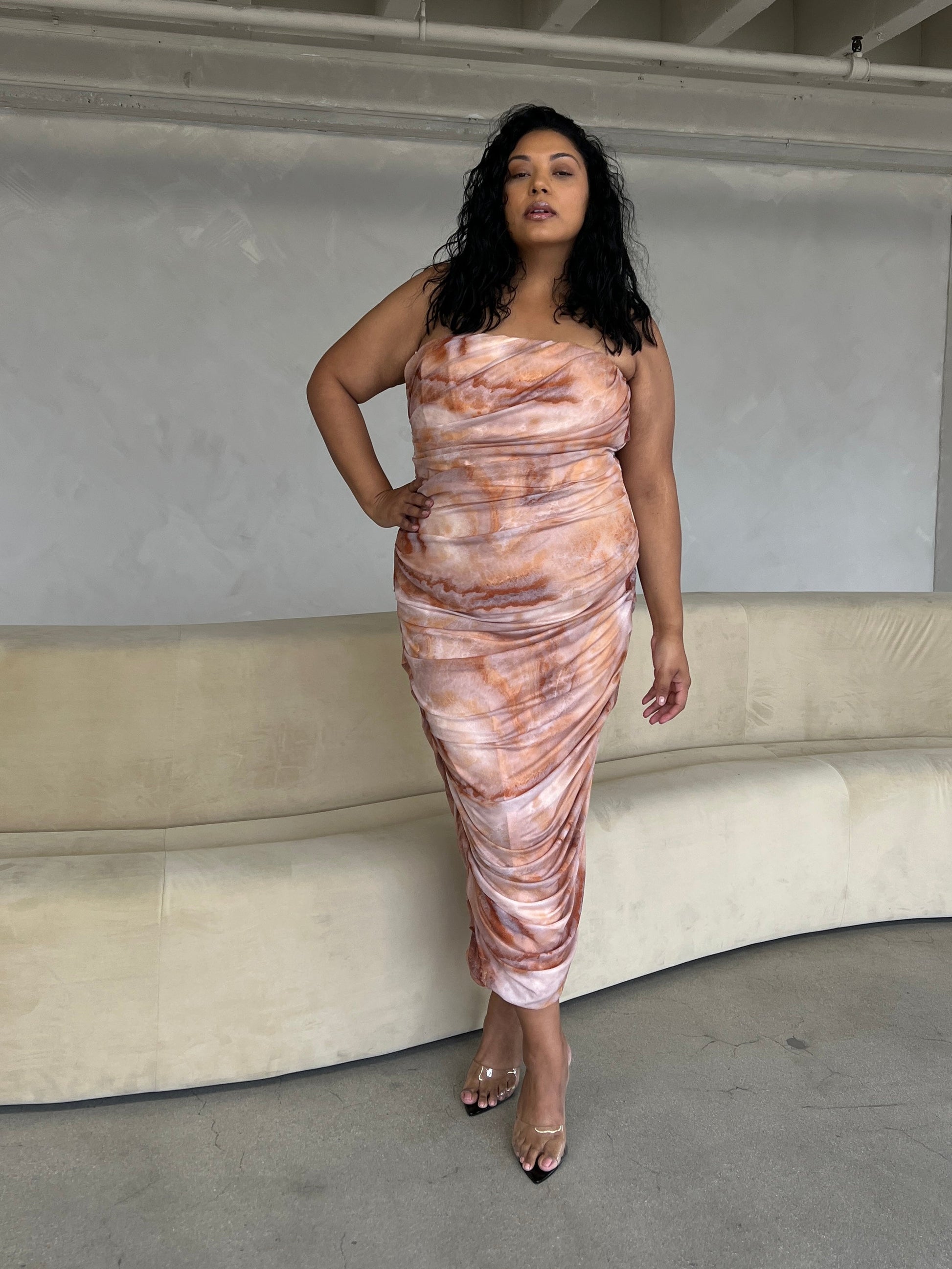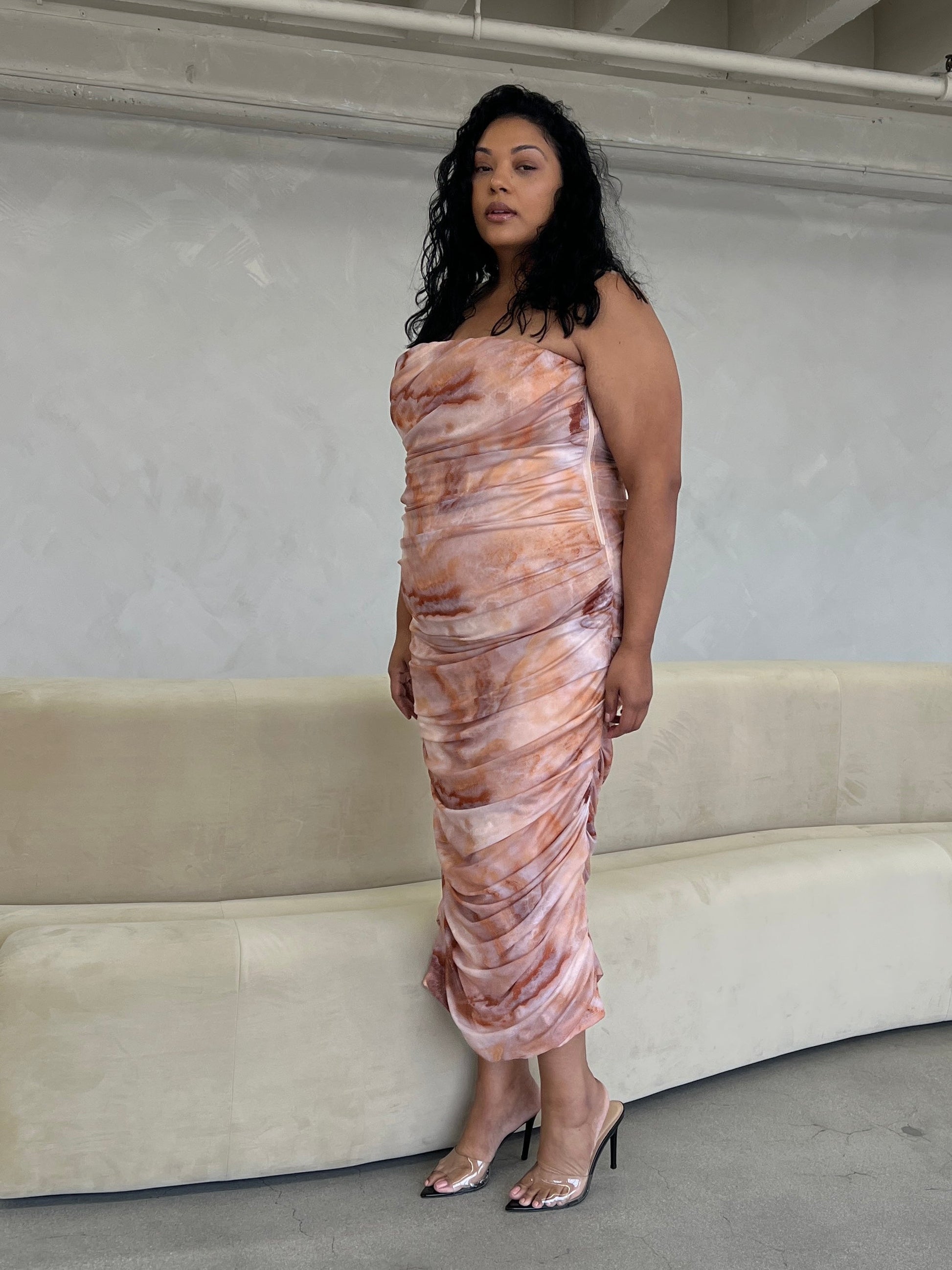 Our Plus Size Tie Dye Ruched Dress is a perfect?addition to your wardrobe. With a fun tie-dye pattern, a feminine ruched waist, and an open back, it's guaranteed to make you feel beautiful and elegant. Grab your favorite and make everyone jealous!
