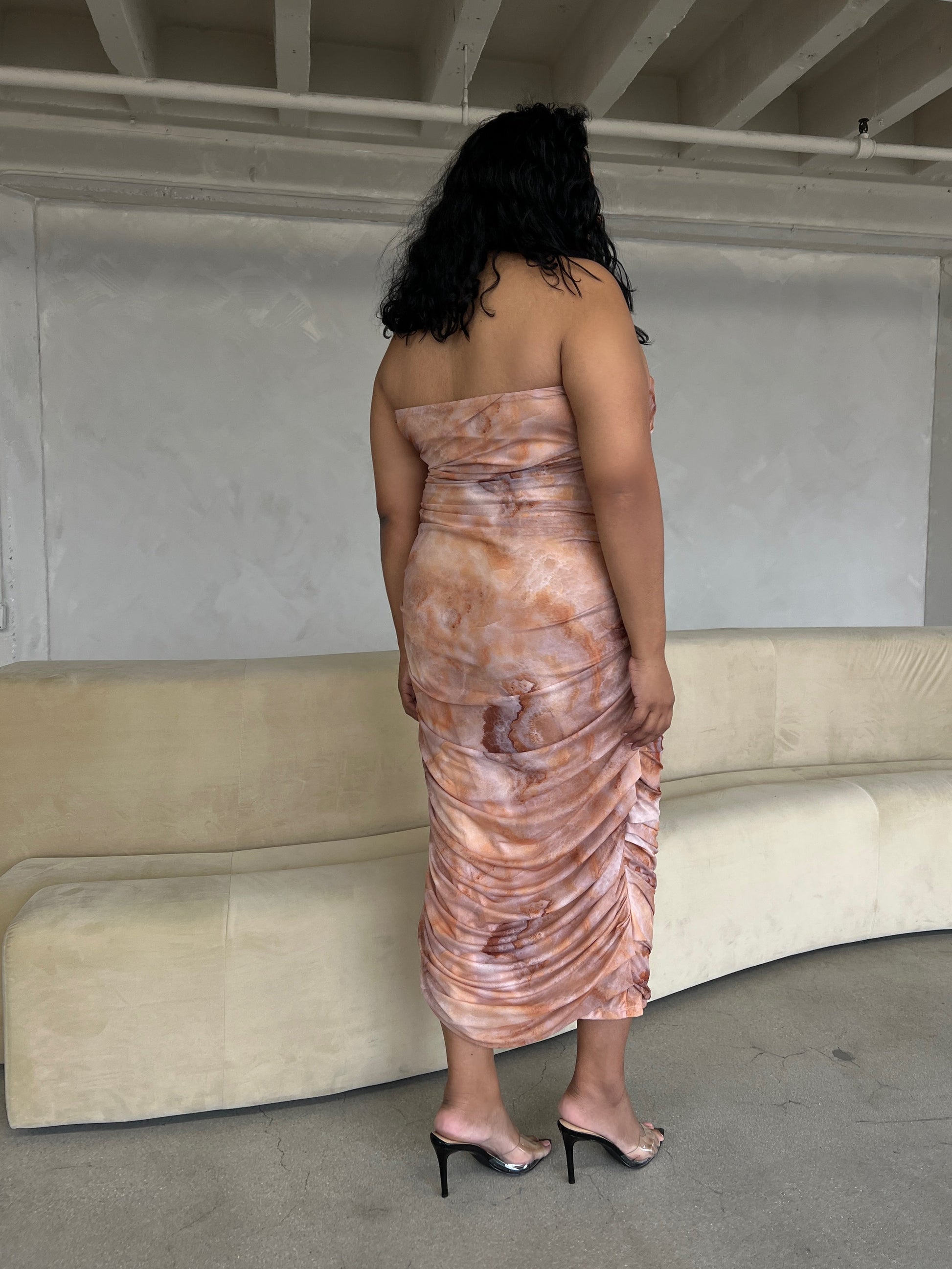- This dress features a sleeveless, sweetheart neckline, ruching all over, a tie-dye pattern, an open back, wiring in the bust, and a midi length.